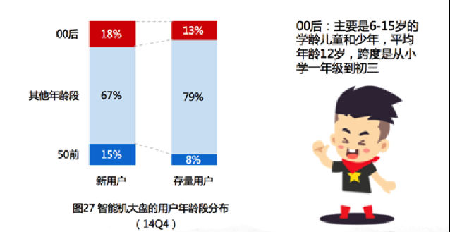 數(shù)據(jù)顯示,2014年下半年智能手機(jī)出貨量之中,新用戶購機(jī)占比僅為31%(13年下半年為48%),越來越多的手機(jī)被售出的原因是用戶要更換新機(jī)。在新增用戶之中,00后和50前占比正在快速上升。00后指的是2000年之后出生的用戶,實(shí)際上主要是6-15歲,小學(xué)一年級到初三的學(xué)生;50前則是年齡已超過55歲的老人??梢娨苿踊ヂ?lián)網(wǎng)正在向“兩端拓展”。