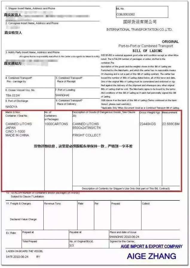 貨代提單---面對發(fā)貨人和收貨人使用。船東提單---面對貨代起運港分公司和貨代目的港分公司使用。貨代提單中,貨物詳細信息內(nèi)容,必須是跟船東提單保持一致,嚴格到一字不差。船東提單中,貨物詳細信息內(nèi)容,必須是跟貨代提單保持一致,嚴格到一字不差。