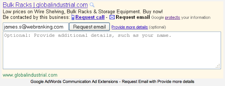 那么在adwords賬戶中除了可以設(shè)置常見(jiàn)的一些擴(kuò)展外,Google還在測(cè)試一系列新的廣告擴(kuò)展,其中的Communication Extension就非常適合我們的外貿(mào)B2B企業(yè)使用,大家都明白外貿(mào)B2B網(wǎng)站的目的就是要獲取Leads即詢盤,由于他和外貿(mào)B2C平臺(tái)的經(jīng)營(yíng)性質(zhì)完全不同(后者注重Sales銷售)所以這種Communication Extension就是完全為L(zhǎng)eads打造的一種廣告形式,讓我們來(lái)看下圖了解下這個(gè)擴(kuò)展到底是神馬東東。