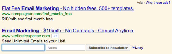 用戶可以輸入自己的郵箱地址以及所需要了解的信息之后發(fā)送給企業(yè),企業(yè)根據(jù)用戶信息的需求來(lái)進(jìn)行答復(fù),從海外推廣的角度來(lái)說(shuō),這樣一個(gè)來(lái)往已經(jīng)成功的獲取了一個(gè)詢盤轉(zhuǎn)換。上面這些是2011年的谷歌廣告截圖,那么今年谷歌又?jǐn)U大了測(cè)試范圍,同時(shí)改進(jìn)了展示的外觀,如下圖: