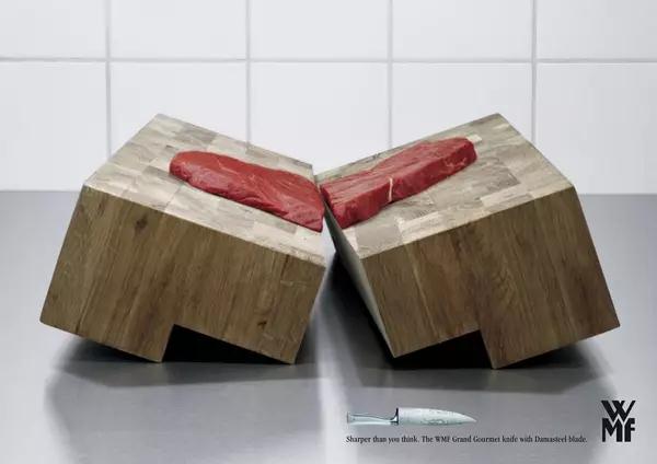 從上個(gè)分析中我們得到創(chuàng)意就是給人意想不到的效果,給人驚喜,而在廣告的運(yùn)用中,創(chuàng)意更是最核心的部分,如Scotch運(yùn)用非常簡(jiǎn)單的畫面,貼上膠帶,就算把堅(jiān)硬的圖釘掰彎了都撕不下了,來比喻他們的產(chǎn)品質(zhì)量超群,而wmf也是運(yùn)用的相同的手法,一把小刀太過鋒利導(dǎo)致把整張桌子都切成兩半,也是用非??鋸埖氖址▉韽?qiáng)調(diào)他們產(chǎn)品的功能性,打破了固有的思維方式,給了消費(fèi)者意想不到的結(jié)果,所以創(chuàng)意應(yīng)該是,情理之中卻是意料之外的。
