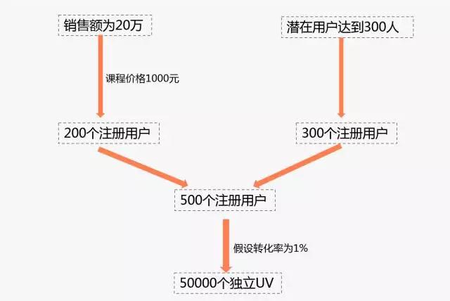 比如總目標(biāo):5月份銷售額為20萬,潛在用戶達(dá)到300人。根據(jù)公式:銷售額=UV*客單價(jià)*轉(zhuǎn)化率??蛦蝺r(jià)是確定的,課程售價(jià)1000元,轉(zhuǎn)化率根據(jù)網(wǎng)站平均轉(zhuǎn)化率1%估算。此刻也可以使用反推法。