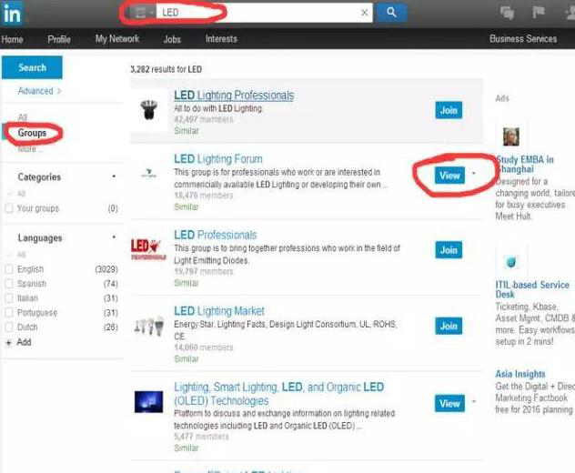 我們登陸頁面后,可以通過產(chǎn)品進(jìn)行搜索,會搜索出來很多我們想要的結(jié)果,然后選擇GROUPS,我們會看到有view和join這兩個詞。一般選擇view的先進(jìn)去,其次點擊join加入,然后就是耐心的等待審核。我以LED為例給大家示范下: