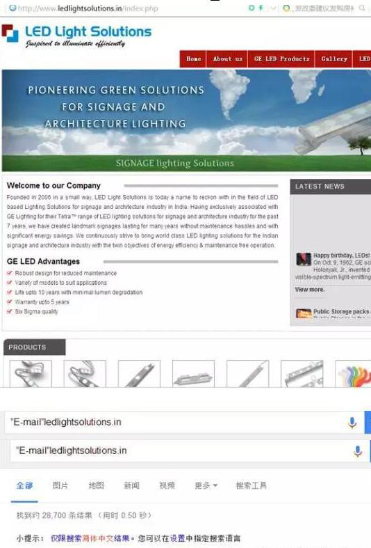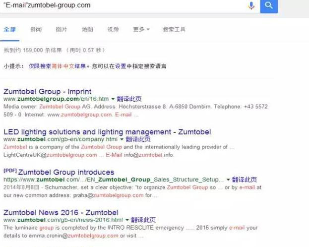 有時候也會遇到打不開客戶公司網(wǎng)址的情況,那么這時候就需要結(jié)合谷歌搜索客戶的其他信息,方法是英文引號郵箱+客戶的域名:示范如下”E-mail”zumtobel-group.com,如下圖所示:
