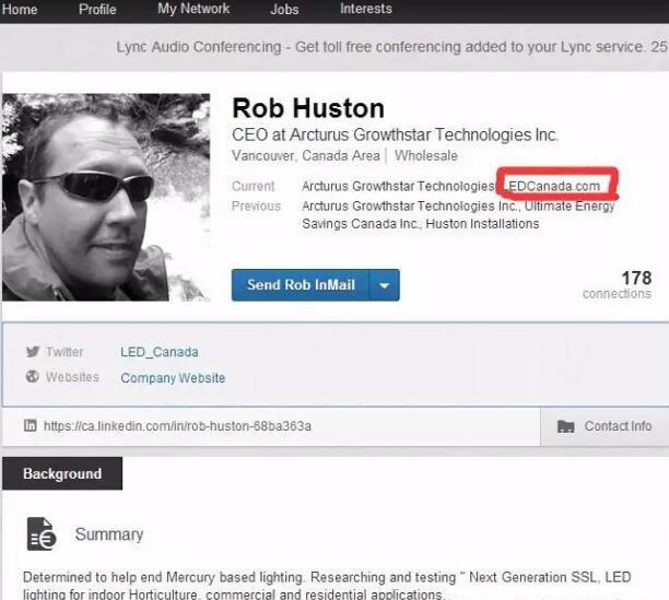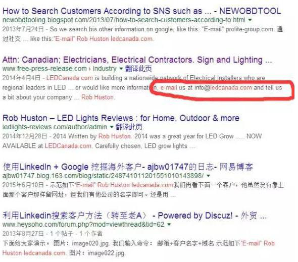 當(dāng)我們再看另一個客戶的頁面時,看到了他留的公司信息,但打開后發(fā)現(xiàn),他們網(wǎng)站上也是沒有留郵箱。但是沒有關(guān)系,只要熟悉google搜索方法,通常郵箱都可以挖出來。這次是使用郵箱+客戶名字+域名,示范如下”E-mail” Rob Huston ledcanada.com。