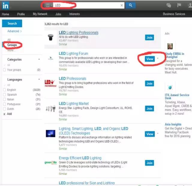 我們登陸頁(yè)面后,可以通過產(chǎn)品進(jìn)行搜索,會(huì)搜索出來很多我們想要的結(jié)果,然后選擇GROUPS,我們會(huì)看到有view和join這兩個(gè)詞。一般選擇view的先進(jìn)去,其次點(diǎn)擊join加入,然后就是耐心的等待審核。我以LED為例給大家示范下: