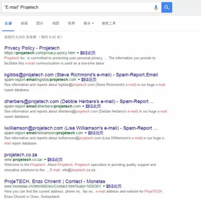 有時(shí)候也會(huì)遇到打不開客戶公司網(wǎng)址的情況,那么這時(shí)候就需要結(jié)合谷歌搜索客戶的其他信息,方法是英文引號(hào)郵箱+客戶的域名:示范如下”E-mail”zumtobel-group.com,如下圖所示: