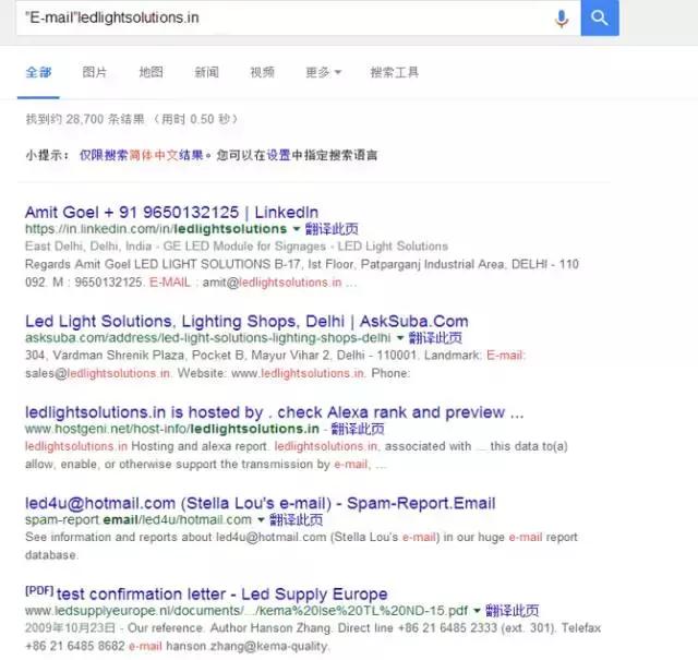 分享完如何用LinkedIn 中的GROUPS結(jié)合谷歌找客戶之后,下面就來分享companies結(jié)合谷歌找客戶,我以LED light為例。輸入LED light后會(huì)出現(xiàn)很多我們想要的東西,我隨便寫一個(gè)進(jìn)去,進(jìn)入網(wǎng)站后經(jīng)過了解發(fā)現(xiàn)是我們的目標(biāo)客戶,但是網(wǎng)上沒有客戶的郵箱,這時(shí)可以聯(lián)合Google進(jìn)行查找。如下圖所示: