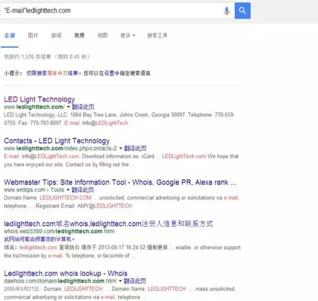 當(dāng)我們?cè)倏戳硪粋€(gè)客戶的頁(yè)面時(shí),看到了他留的公司信息,但打開后發(fā)現(xiàn),他們網(wǎng)站上也是沒有留郵箱。但是沒有關(guān)系,只要熟悉google搜索方法,通常郵箱都可以挖出來。這次是使用郵箱+客戶名字+域名,示范如下”E-mail” Rob Huston ledcanada.com。