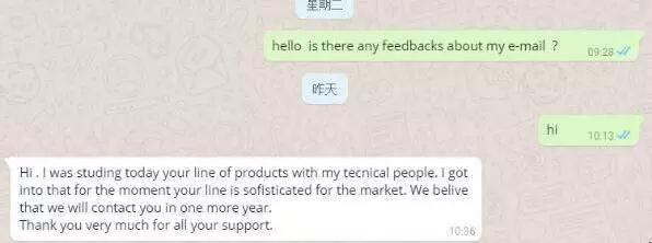 誰知道他直接給了來了上面一段話,意思是我們的產(chǎn)品暫時(shí)不適合他的市場(chǎng),一年之后再聯(lián)系你。