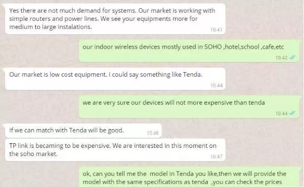 客戶還說TP-link的貴,tenda的不錯(cuò)。正好,我們的價(jià)格絕對(duì)比他們便宜,質(zhì)量不會(huì)差,乘機(jī)問問他喜歡tenda的什么型號(hào),來對(duì)比下我的,推薦我們的給他。