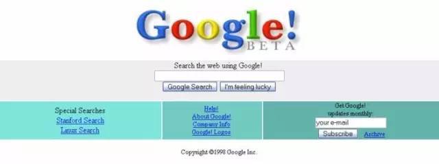 Google1998年的頁(yè)面,標(biāo)識(shí)后面也有個(gè)驚嘆號(hào),可能在模仿Yahoo!