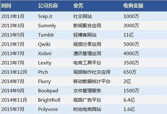 2012年,“硅谷女神”瑪麗莎·梅耶爾出任雅虎CEO,先后收購(gòu)了50多家公司,涉及社交網(wǎng)站、輕博客、視頻、游戲、電話會(huì)議系統(tǒng)等領(lǐng)域。