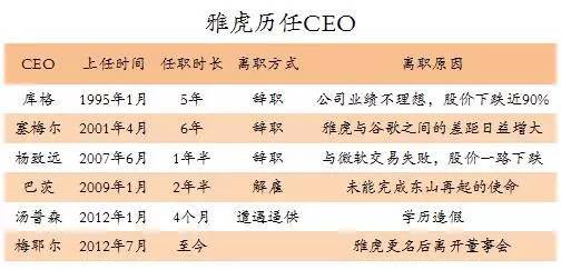 更加奇葩的是,雅虎22年換了7任CEO,最長(zhǎng)的任期6年,短的僅4個(gè)月就被董事會(huì)趕下臺(tái)。