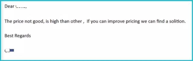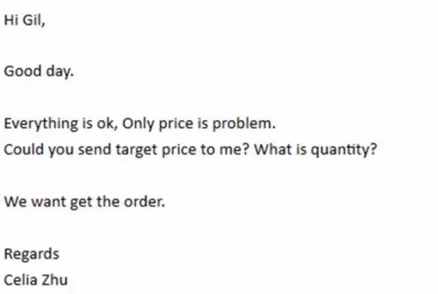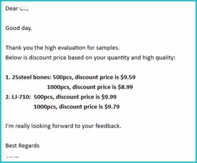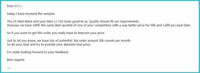 在這封郵件里,可以看到客戶對于樣品的質(zhì)量很滿意,但客戶很精明,說他們有收到其他供應(yīng)商更好的價(jià)格,同時(shí)還拋出了他每月的預(yù)訂數(shù)量,給買方畫了一個(gè)大餅。
