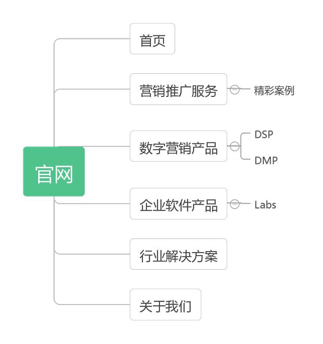回歸到我們的官網(wǎng)本身,需要對功能進(jìn)行優(yōu)先級劃分。綜合此次改版目標(biāo):突出營銷和豐滿產(chǎn)品線,因此把營銷單獨(dú)作為一個菜單板塊,放置在首頁之后,把公司介紹放在最后。其次,根據(jù)關(guān)鍵詞的屬性聚合出分類,把DSP,DMP,ADX,SSP聚合成數(shù)字營銷產(chǎn)品;把Labs歸入到軟件產(chǎn)品同樣有技術(shù)研究屬性的功能下;把案例歸入到營銷推廣服務(wù)下。最后提煉出來的產(chǎn)品框架如下: